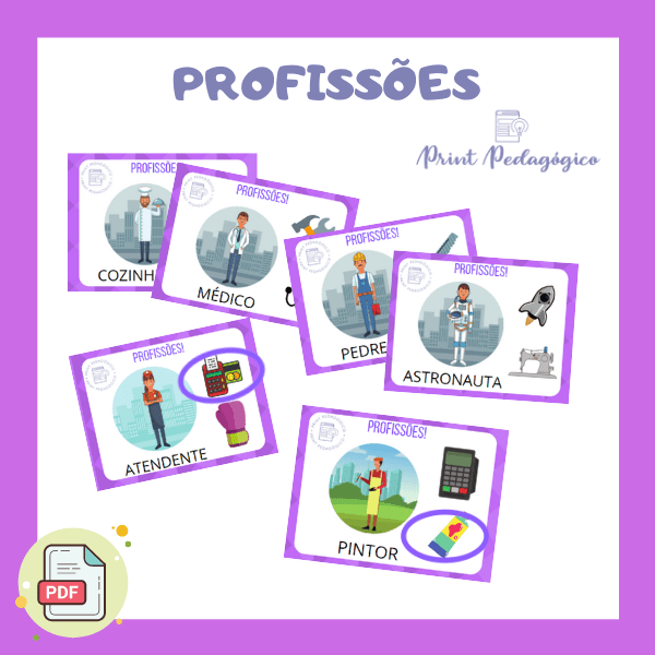 20 fichas ilustradas com uma profissão e diversos instrumentos, objetos, ferramentas, para associar corretamente.