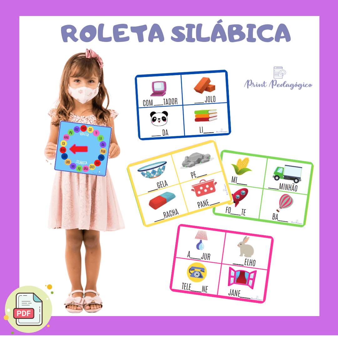 CONTEÚDO: 01 roleta silábica. 08 fichas com 04 palavras, totalizando 32 palavras para completar as lacunas.